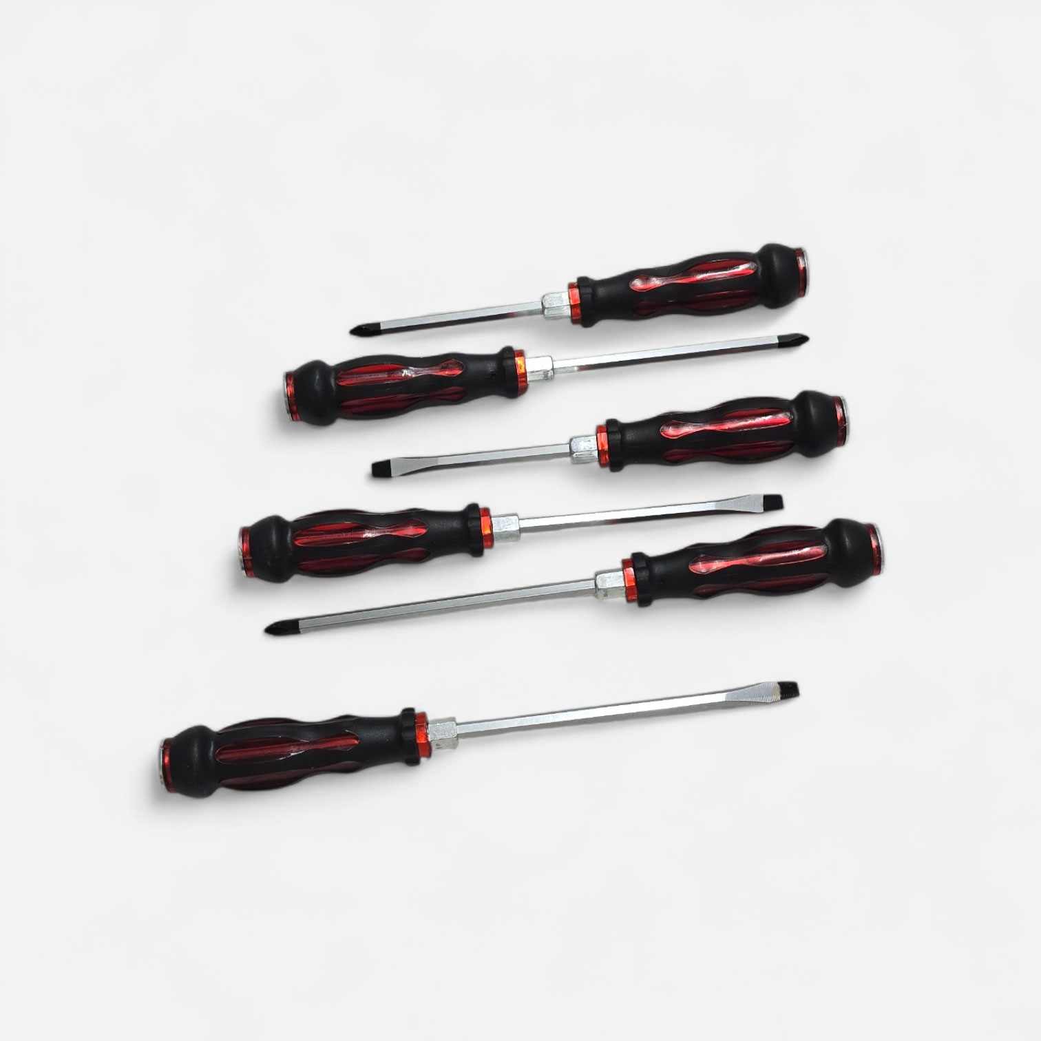 Set de destornilladores manuales para reparaciones básicas, fabricados en materiales resistentes y uso doméstico frecuente.